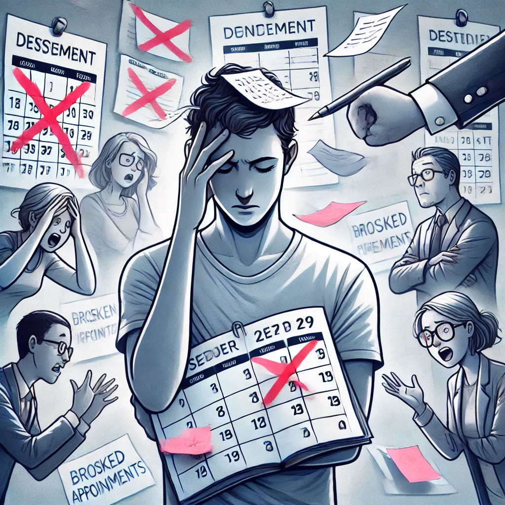 - 과로, 시간 부족, 복잡한 일정으로 인해 의도치 않게 약속을 놓침.