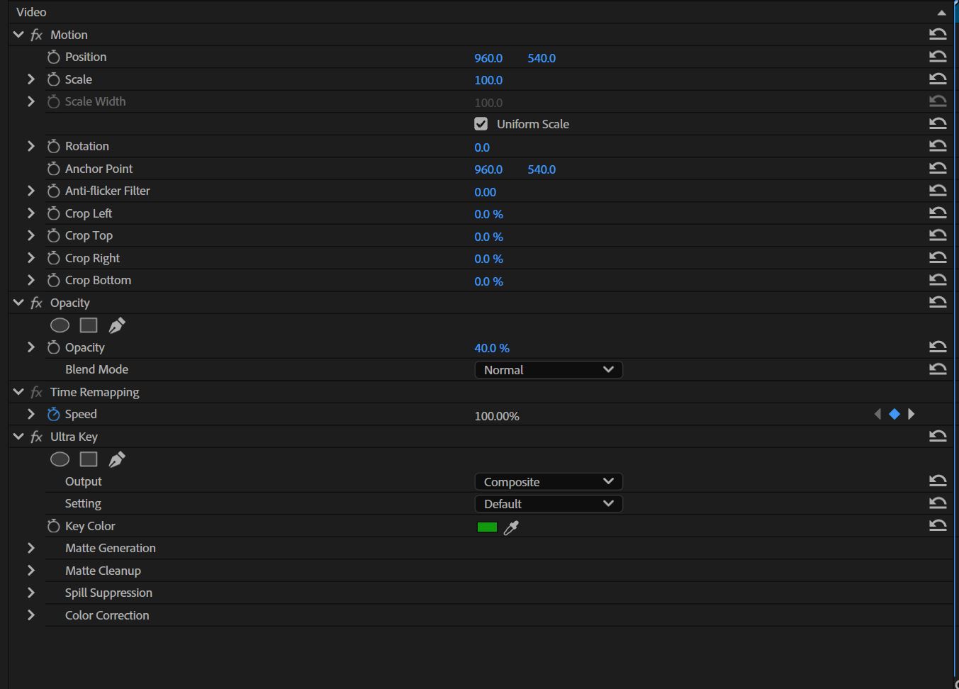 - Ultra Key 효과 적용 후 Key Color로 그린스크린 제거.