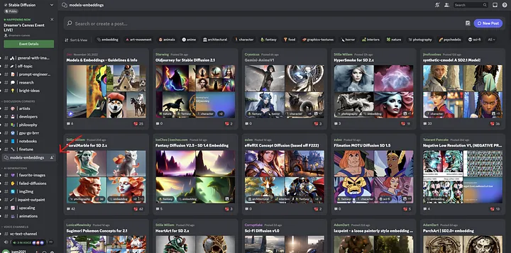 3. Discord: Stable Diffusion의 Discord 페이지에서 만든 'Models-Embeddings' 채널에는 무료로 다운로드할 수 있는 다양한 모델들이 있습니다. HuggingFace나 Civitai로 이동하는 링크가 있습니다.