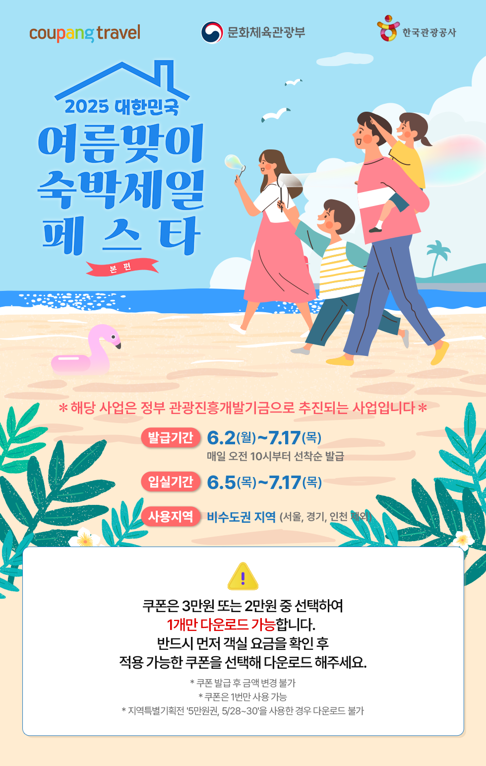 이번 '2025 대한민국 여름맞이 숙박세일 페스타' 본편을 통해 합리적인 가격으로 아름다운 비수도권 지역에서 잊지 못할 여름 추억을 만들어 보세요! 선착순 발급이니, 지금 바로 쿠팡트래블에서 쿠폰을 다운로드하고 여행을 계획해 보세요!