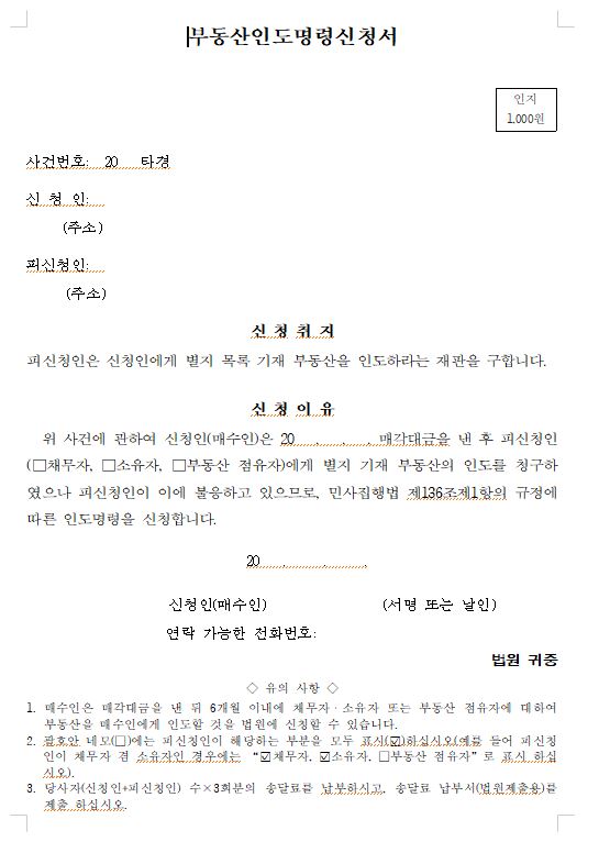 1. **청구의 신청**: 인도명령을 청구하기 위해서는 먼저 법원에 신청서를 제출해야 합니다. 신청서에는 부동산의 소유권을 증명하는 서류, 임대차 계약서, 임차인의 퇴거 요청 이력 등을 첨부합니다.